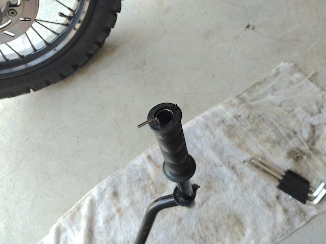 パーツクリーナーと併用して、ハンドルとグリップの間に先が丸くなった工具などを差し込み捻るのも効果的です。
