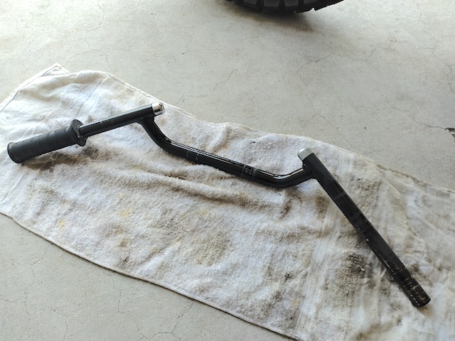 今回は幅が狭く角度のついたセパハン風コンチハンドルから、オフ車で一般的なブレース付きの幅が広い汎用アルミバーハンドルに交換しました。