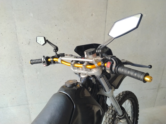 ハンドルを含め長らく街乗りプチツー仕様だったオフロードバイク。今回は林道ツーリングで操作しやすい幅広バーハンドルに交換しました。