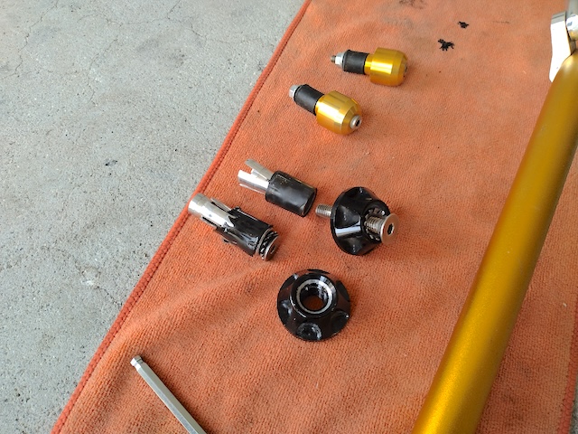 ハンドル本体を外す前にまず、バーエンドやブレーキホース、スロットルケーブル、電気線などがつながるステアリング周辺の部品を外します。