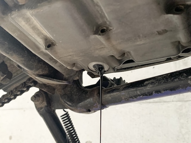 時々車体を揺らしたりしながら放置して、古いオイルはできるだけ抜いてしまいます。