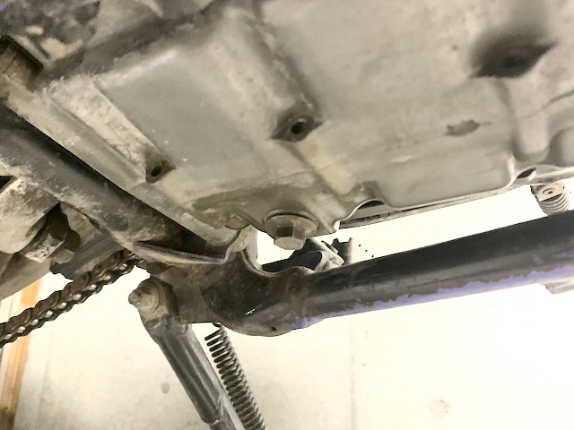 古いエンジンオイルを排出するオイルパンの穴、ドレンボルトの下に廃油ボックスを置きます。