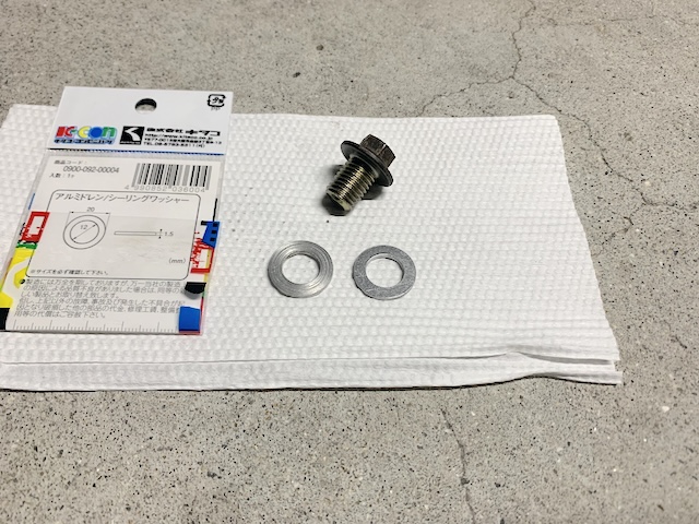 オイルが流れ出なくなったらネジ穴の小さなゴミごとオイルを拭き取り、新しいドレンワッシャーをかましたドレンボルトを締めつけます。