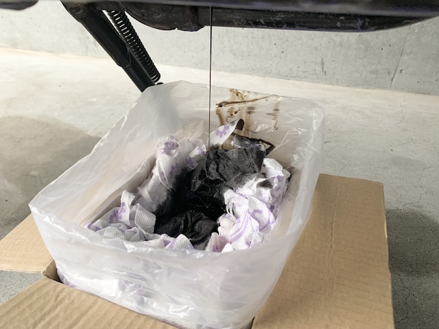 ボルトを抜く瞬間はあらぬ方向にオイルが跳ねる場合があるので、できるだけ広範囲で養生しておくと安心です。