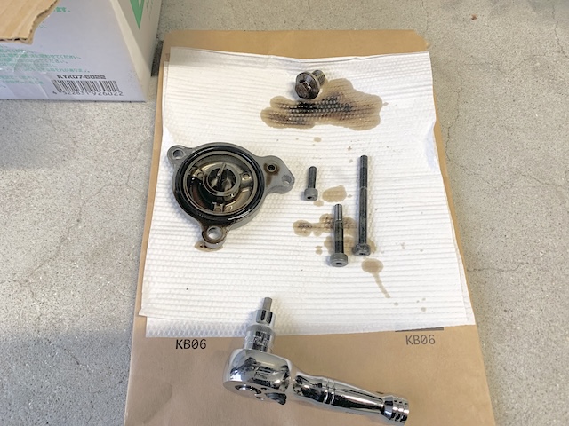 ボルトを抜き、エンジンオイルが溢れ出るので注意しながらカバーを外します。