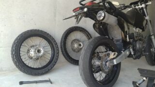 バイク バイクのホイール交換|モタード→オフロード|メンテナンススタンド 地道なキャブ洗浄や消耗部品の交換メンテで、なんとかエンジンが掛かったモタード風バイク。今回は長らく愛用していたロードタイヤを履かせたエキセルリムのホイールを、再びで林道を走るべくオフロードタイヤを装着した純正ホイールに戻してみました。 2025.09.30 バイク遊び