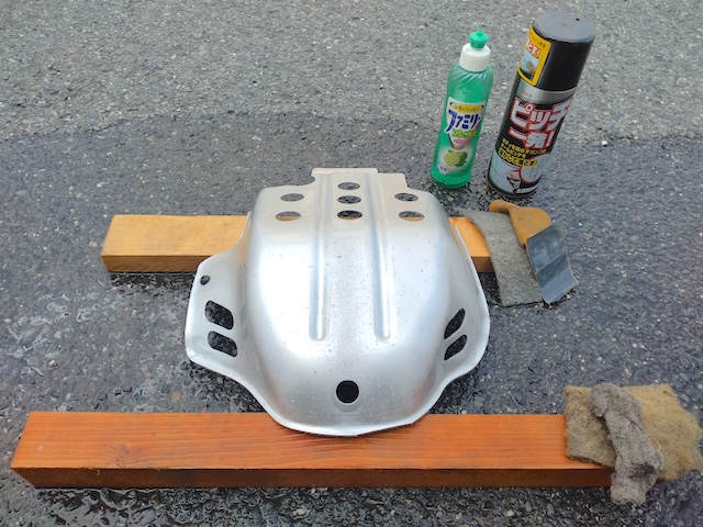 届いたアンダーガードを洗浄して、できる範囲で綺麗にします。アルミサビが出ているものの、凹みや変形もなく非常に良い状態です。